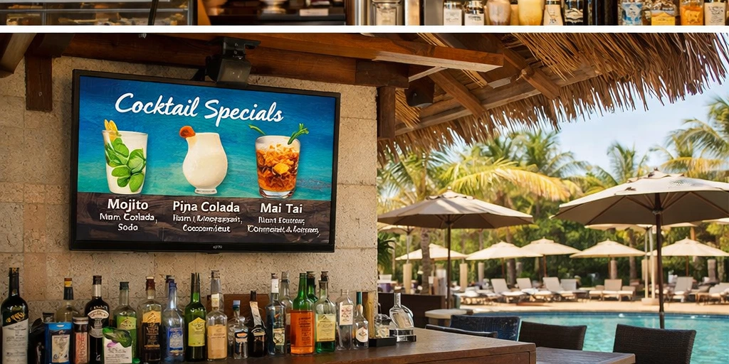 - Poolside and outdoor bar menus. Outdoor-rated displays for alfresco dining, beer gardens and resort pool areas. These sit in the hardest environment in the building.