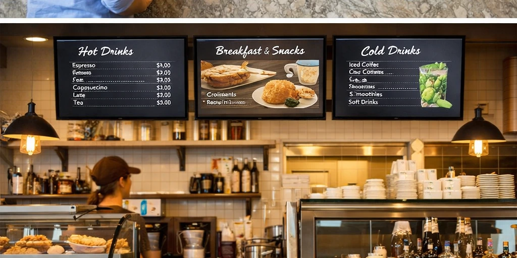 - Restaurant menu boards. Indoor displays behind the counter or along a wall, used for full menus, daily specials and drink listings. Usually run continuously through trading hours.