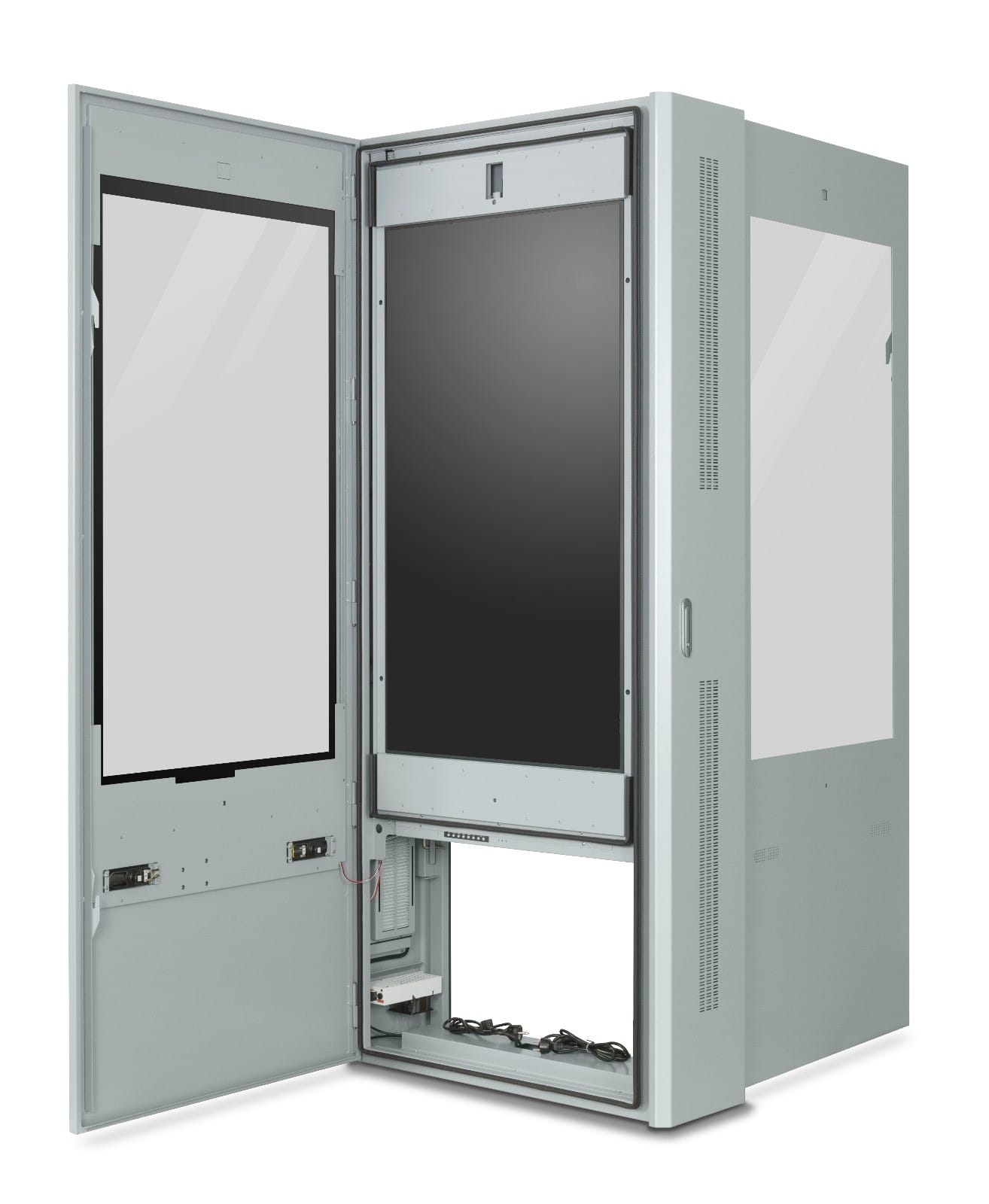 55″ Dual Sided Outdoor LCD Kiosk with high brightness 2,500nits, weatherproof IP66 rating and 8mm laminated anti-vandal glass with metal front door. Suitable for floor mounting in portrait orientation.